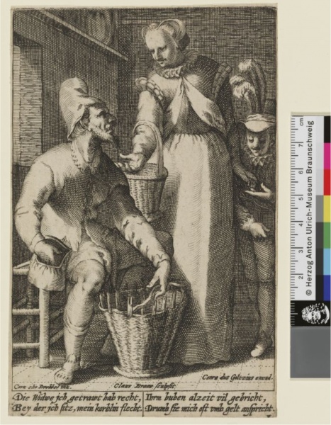 BRON: http://www.virtuelles-kupferstichkabinett.de/de/detail-view Titel [Eine Frau verlangt Geld für ihren herausgeputzten Sohn von ihrem neuen Mann, der einen Korb flicht] Datierung 1588 -1622 Beteiligte Person: Braau, Claes (Stecher); Drebbel, Cornelius Jacobsz. (Inventor); Goltzius (Goltz), Conrad (Verleger)Schule Niederländisch - Ort der Herstellung - Köln; Cologne (Verlagsort) Museumsnr. / Signatur GvBreen AB 3.5 Institution HAUM Technik Kupferstich Wasserzeichen nicht identifiziert Maße in mm Blatt: 156 x 102 Inschrift Die Widwe ich getrawt hab recht bey der job sitz, mein korblin flecht, Ihrm buben alzeit viel gebricht, Drumb sie mich oft umb gelt anspricht. [Inschrift]; Cornelis Drebbel inu. [Inventor]; Claus Braaw sculpsit [Signatur]; Conradus Goltzius excud. [Verlegeradresse]